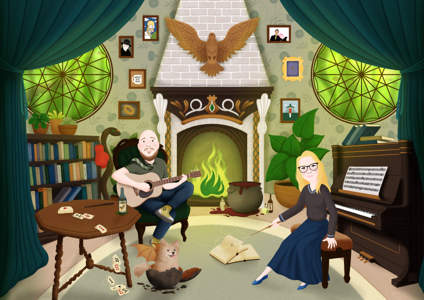 Jeśli jesteś kimś takim jak ja, to przypadkowe obudzenie się w jednej z sypialni Hogwartu byłoby dla Ciebie spełnieniem marzeń. Niestety, nie możemy po prostu spakować naszych kufrów, złapać Nimbusa i przeprowadzić się do świata magii… Ale mogę Cię narysować w jednym z zamkowych pokoi wspólnych, wypełnionym przedmiotami związanymi ze wszystkimi Twoimi pasjami (w formie tematycznych plakatów, książek, eliksirów i innego wyposażenia). Fajny pomysł? No raczej!